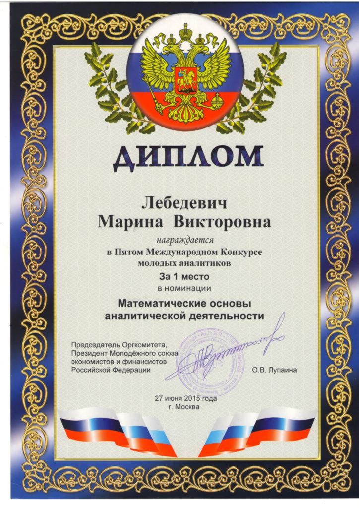 Лебедевич Марина Викторовна, выпускница 2014 года факультета банковского дела, магистрантка, преподаватель-стажер кафедры экономики и организации производства Диплом Пятого Международного Конкурса молодых аналитиков за 1 место в номинации Математические основы аналитической деятельности ![]() |