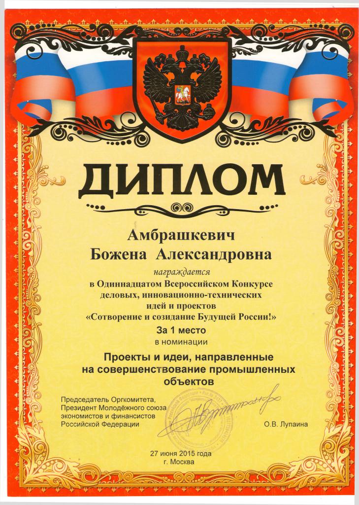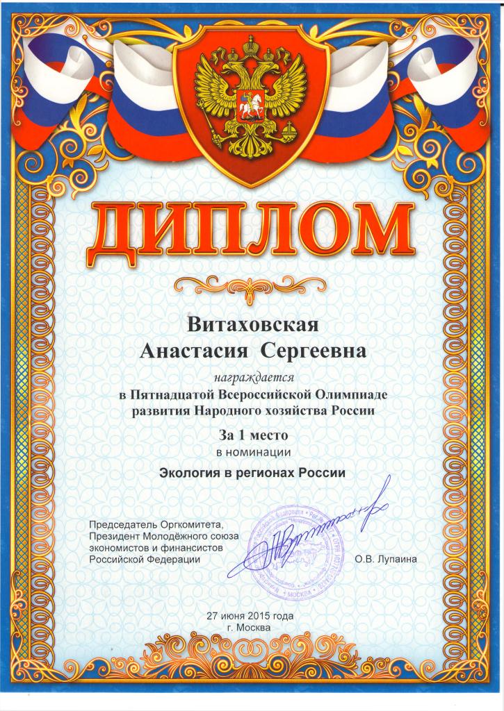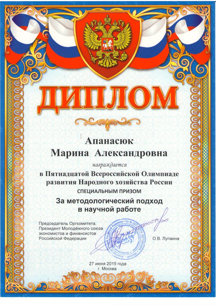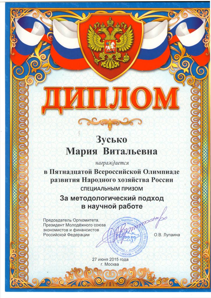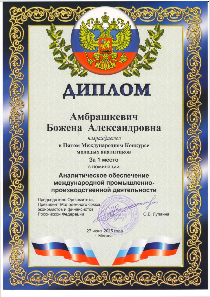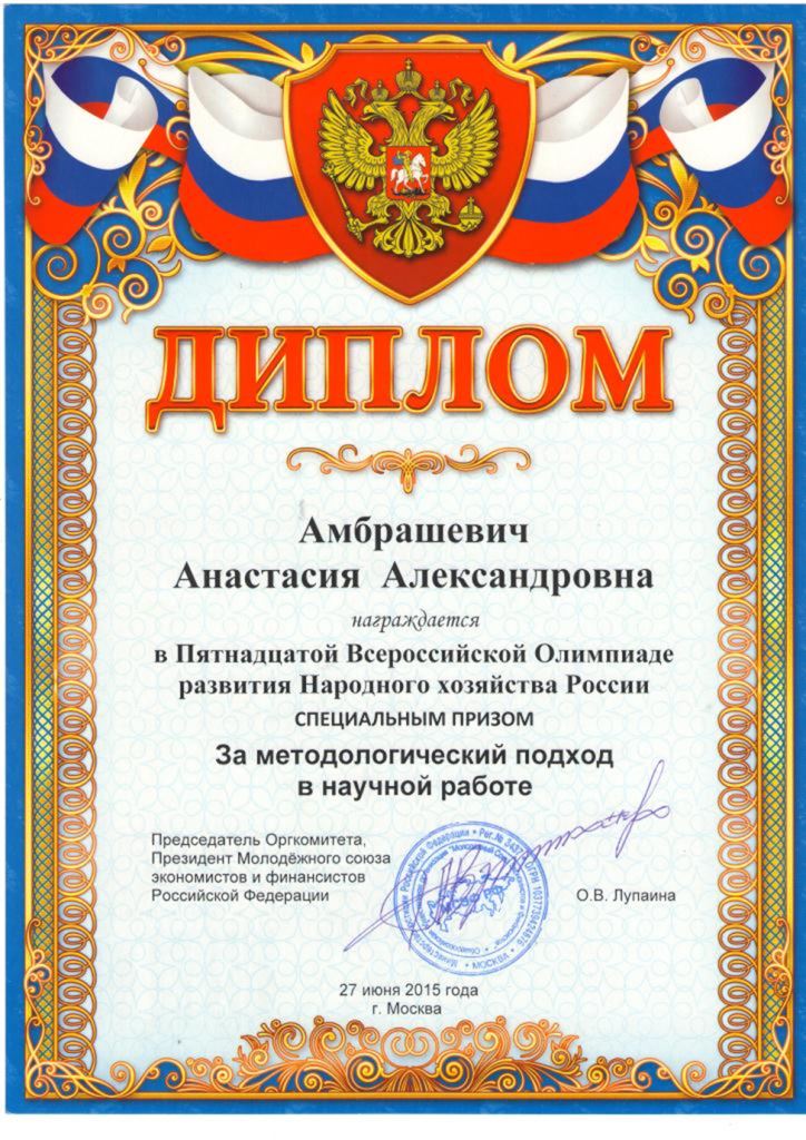 Амбражевич Анастасия Александровна, выпускница 2015 года экономического факультета, специальность экономика и управление на предприятии Диплом Пятнадцатой Всероссийской Олимпиады развития Народного хозяйства России специальный приз За методологический подход в научной работе ![]()
