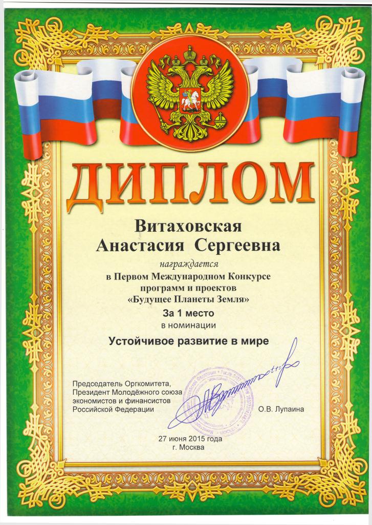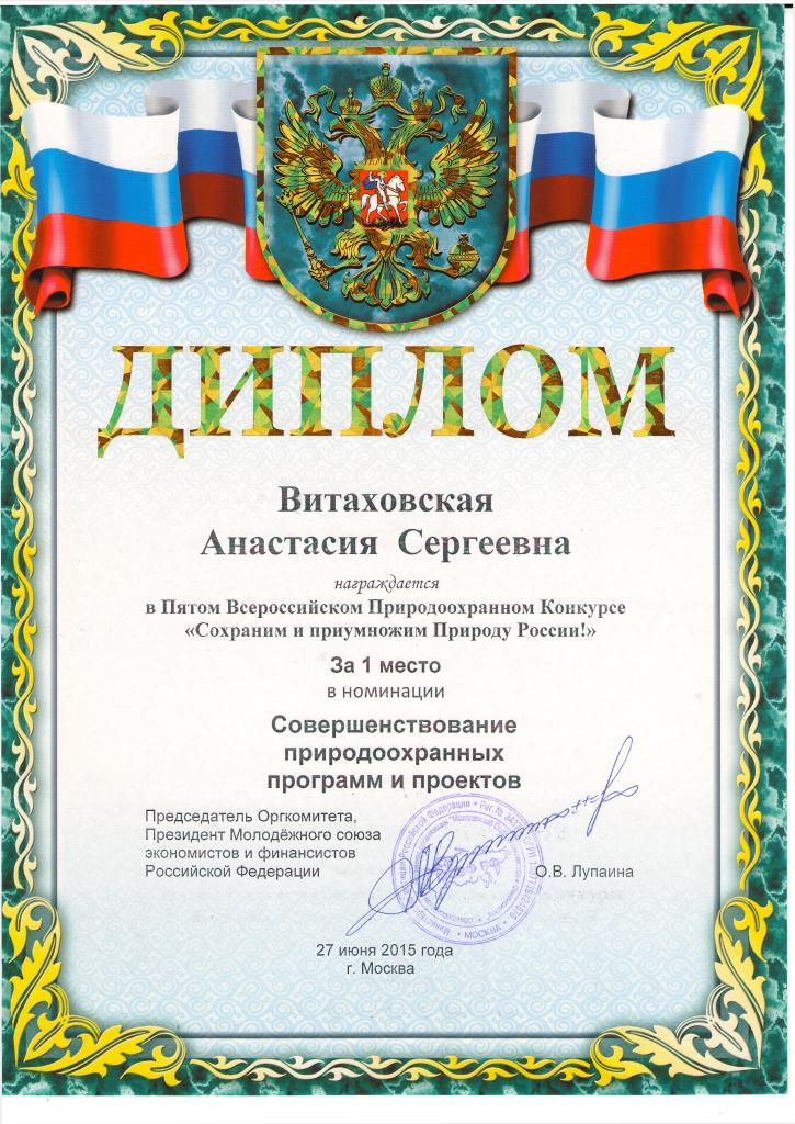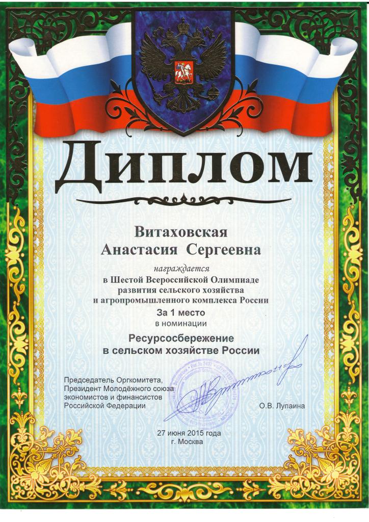 Витаховская Анастасия Сергеевна, аспирантка, ассистент кафедры Менеджмента и маркетинга экономического факультета Диплом Пятого Всероссийского Природоохранного Конкурса «Сохраним и приумножим Природу России!» за 1 место в номинации Совершенствование природоохранных программ и проектов Диплом Первого Международного Конкурса программ и проектов «Будущее Планеты Земля» за 1 место в номинации Устойчивое развитие в мире Диплом Пятнадцатой Всероссийской Олимпиады развития Народного хозяйства России 1 место в номинации Экология в регионах России Диплом Шестой Всероссийской Олимпиады развития сельского хозяйства и агропромышленного комплекса России 1 место в номинации Ресурсосбережение в сельском хозяйстве России ![]() ![]() ![]() ![]() |