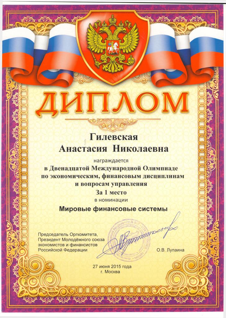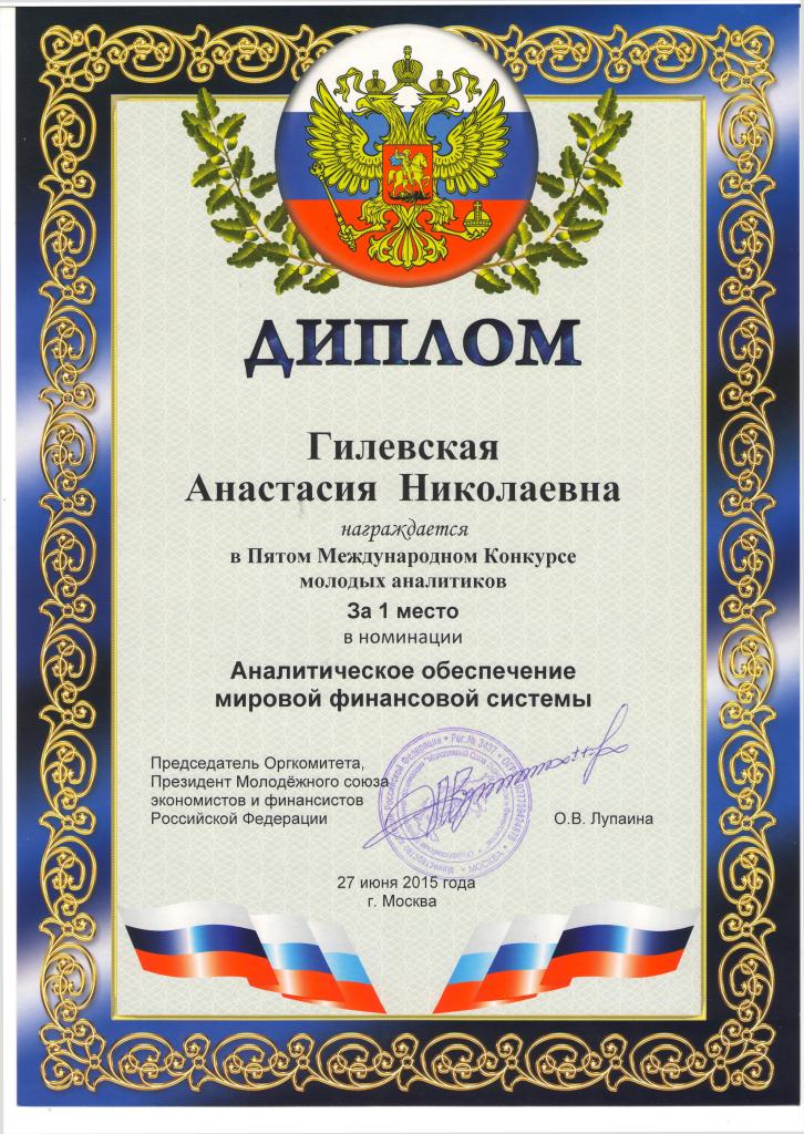 Гилевская Анастасия Николаевна, студентка 4 курса факультета банковского дела, специальность финансы и кредит Диплом Двенадцатой Международной Олимпиады по экономическим, финансовым дисциплинам и вопросам управления за 1 место в номинации Мировые финансовые системы Диплом Пятого Международного Конкурса молодых аналитиков за 1 место в номинации Аналитическое обеспечение мировой финансовой системы ![]() ![]() |