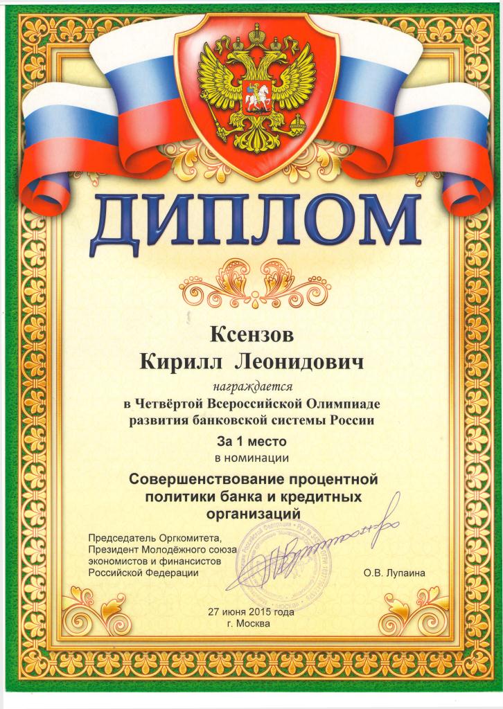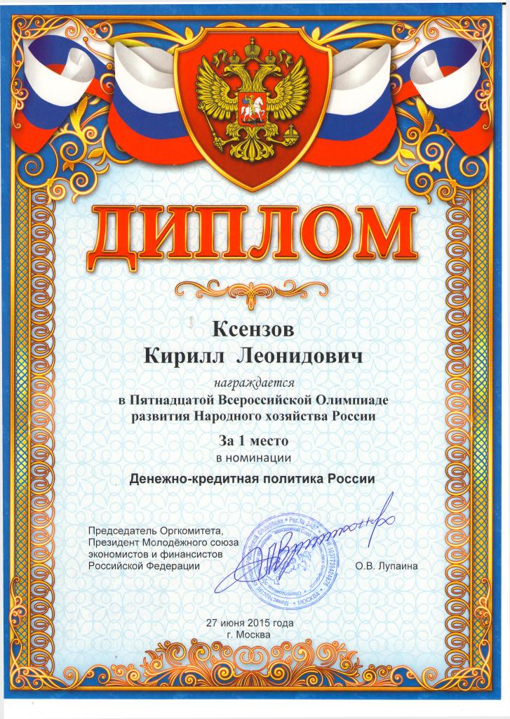 Ксензов Кирилл Леонидович, студент 4 курса факультета банковского дела, специальность финансы и кредит, председатель студенческого научного общества Диплом в Пятнадцатой Всероссийской Олимпиады развития Народного хозяйства России за 1 место в номинации Денежно-кредитная политика России Диплом Двенадцатой Международной Олимпиады по экономическим, финансовым дисциплинам и вопросам управления за 2 место в номинации Денежно-кредитные системы государств Диплом Четвертой Всероссийской Олимпиады развития банковской системы России за 1 место в номинации Совершенствование процентной политики банка и кредитных организаций ![]() ![]() ![]() |