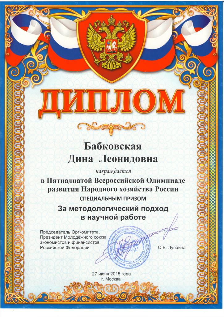 Бабковская Дина Леонидовна, выпускница 2015 года экономического факультета, специальность экономика и управление на предприятии Диплом Пятнадцатой Всероссийской Олимпиады развития Народного хозяйства России специальный приз за методологический подход в научной работе ![]() |
