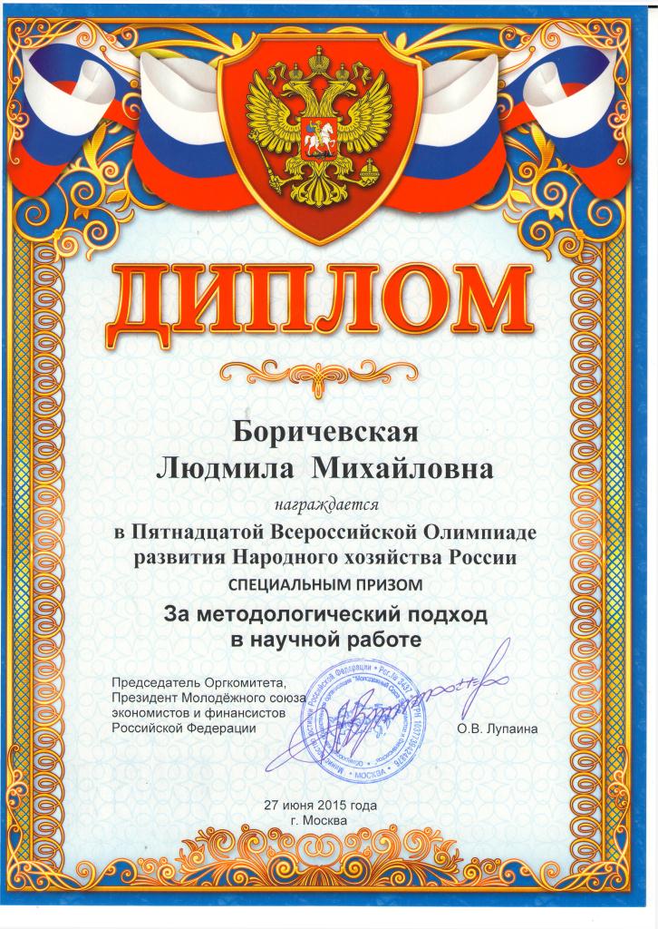 Боричевская Людмила Михайловна, выпускница 2015 года экономического факультета, специальность маркетинг Диплом Пятнадцатой Всероссийской Олимпиады развития Народного хозяйства России специальный приз за методологический подход в научной работе ![]() |