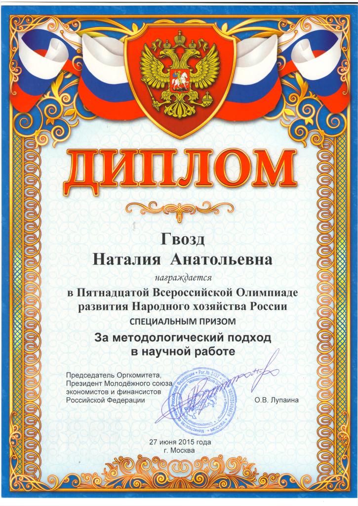 Гвозд Наталия Анатольевна, выпускница 2015 года экономического факультета, специальность экономика и управление на предприятии, магистрант экономического факультета Диплом Пятнадцатой Всероссийской Олимпиады развития Народного хозяйства России специальный приз за методологический подход в научной работе ![]() |