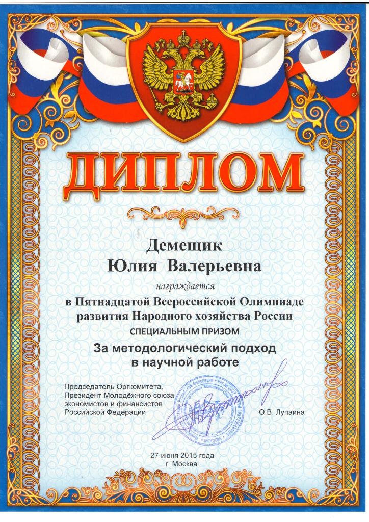 Демещик Юлия Валерьевна, выпускница 2015 года экономического факультета, специальность экономист-менеджер Диплом Пятнадцатой Всероссийской Олимпиады развития Народного хозяйства России специальный приз за методологический подход в научной работе ![]() |