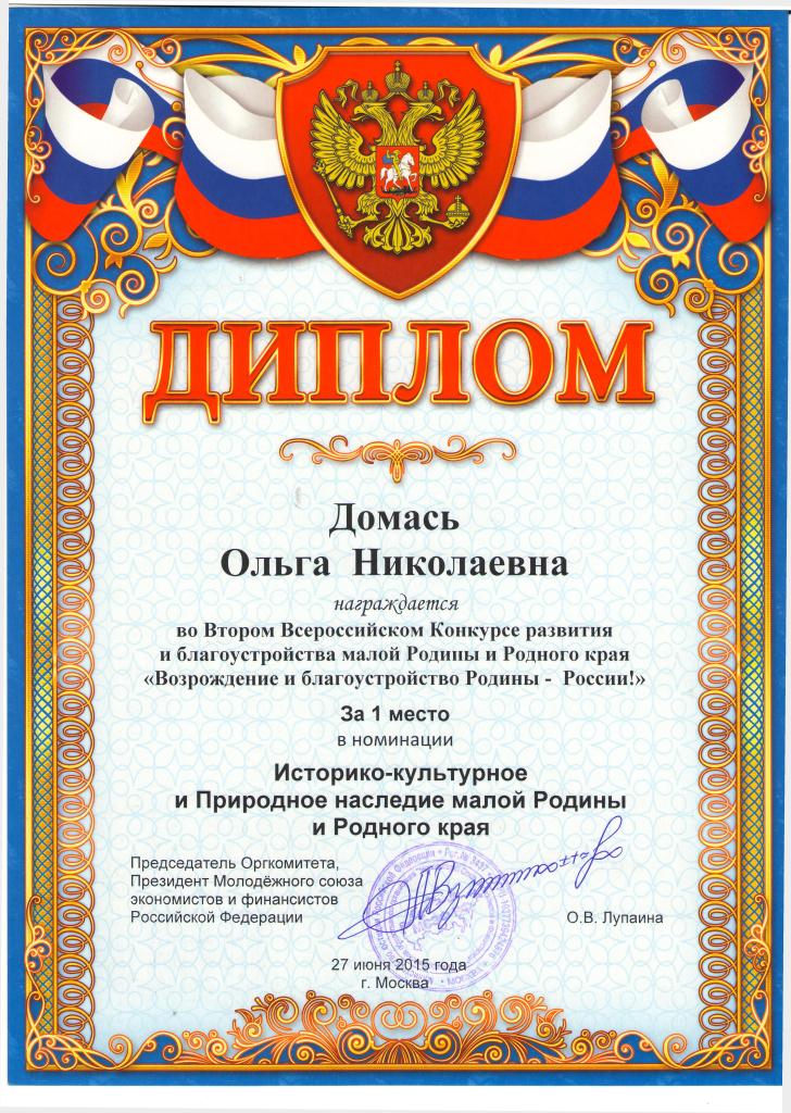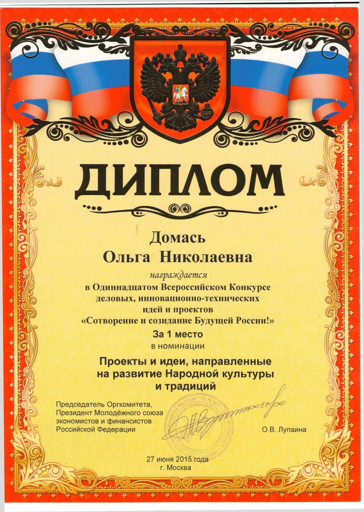 Домась Ольга Николаевна, студентка 4 курса факультета банковского дела, специальность финансы и кредит Диплом Второго Всероссийского Конкурса развития и благоустройства малой Родины и Родного края «Возрождение и благоустройство Родины – России!» за 1 место в номинации Историко-культурное и Природное наследие малой Родины и Родного края Диплом Одиннадцатого Всероссийского Конкурса деловых, инновационно-технических идей и проектов «Сотворение и созидание Будущей России!» за 1 место в номинации Проекты и идеи, направленные на развитие Народной культуры и традиций ![]() ![]() |