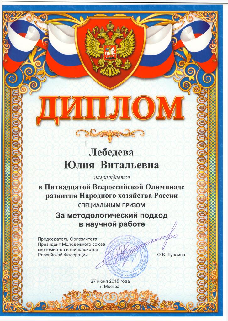 Лебедева Юлия Витальевна, выпускница 2015 года экономического факультета, специальность экономика и управление на предприятии, магистрантка Диплом Пятнадцатой Всероссийской Олимпиады развития Народного хозяйства России специальный приз За методологический подход в научной работе ![]() |
