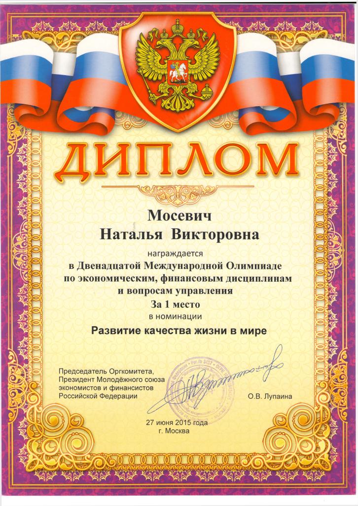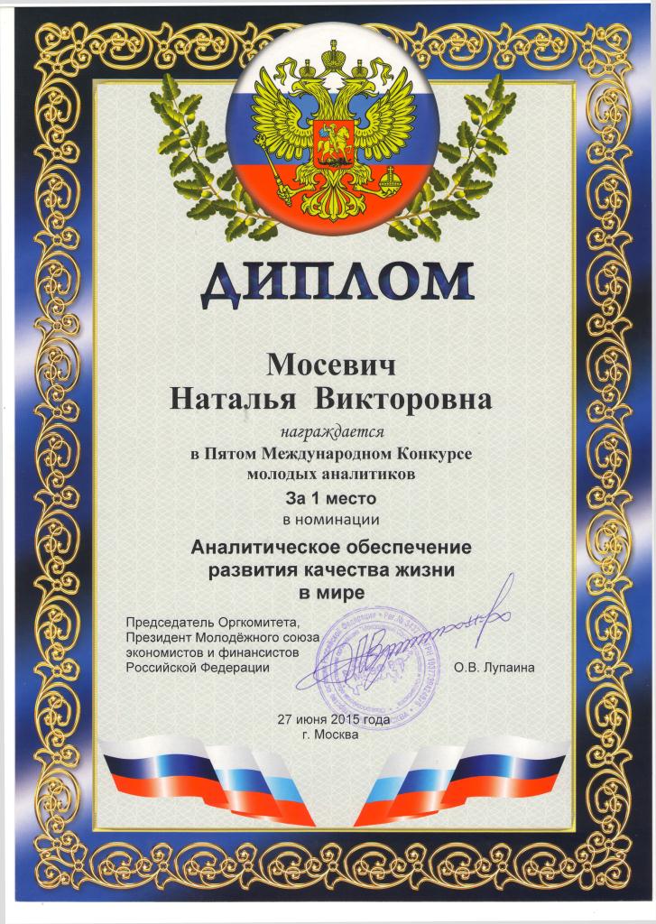 Мосевич Наталья Викторовна, студентка 4 курса факультета банковского дела, специальность финансы и кредит Диплом Двенадцатой Международной Олимпиады по экономическим, финансовым дисциплинам и вопросам управления за 1 место в номинации Развитие качества жизни в мире Диплом Пятого Международного Конкурса молодых аналитиков за 1 место в номинации Аналитическое обеспечение развития качества жизни в мире ![]() ![]() |