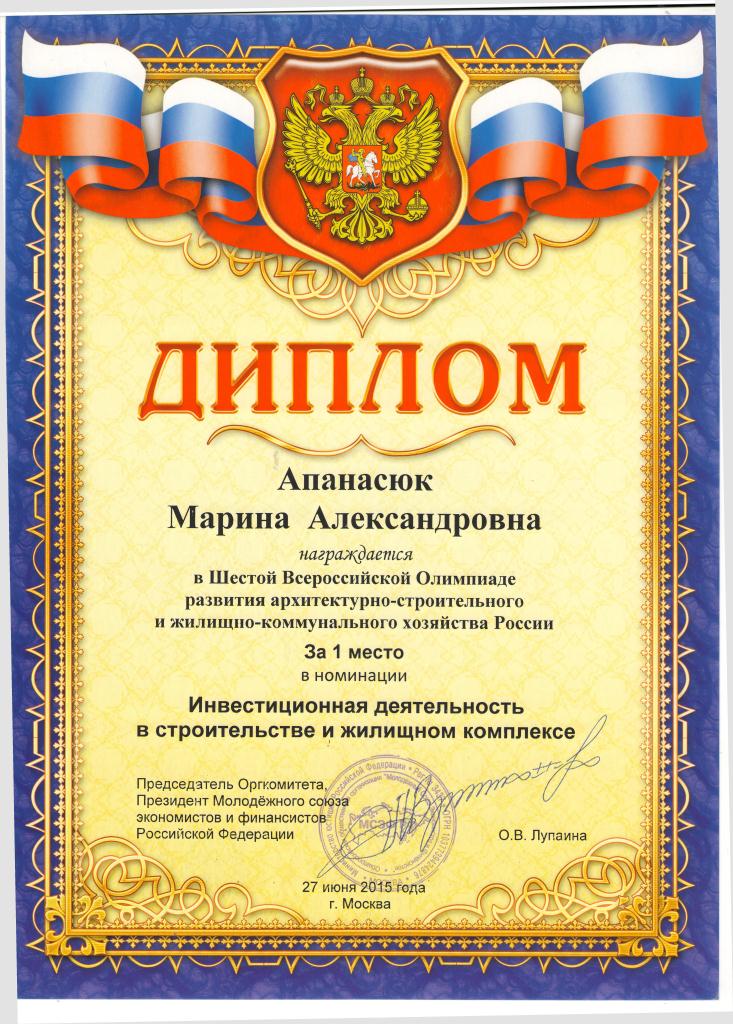 Апанасюк Марина Александровна, выпускница 2015 года экономического факультета, специальность экономика и управление на предприятии Диплом Шестой Всероссийской Олимпиады развития архитектурно-строительного и жилищно-коммунального хозяйства России 1 место в номинации Инвестиционная деятельность в строительстве и жилищном комплексе Диплом Пятнадцатой Всероссийской Олимпиады развития Народного хозяйства России специальный приз за методологический подход в научной работе ![]() ![]() |