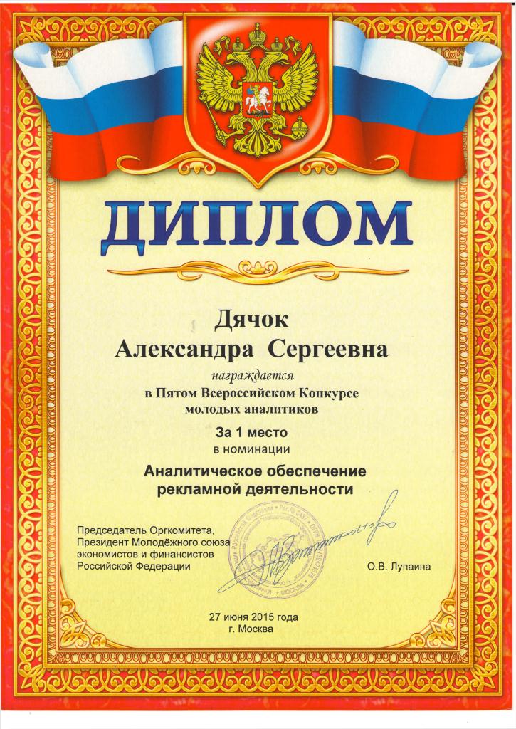 Дячок Александра Сергеевна, студентка 4 курса экономического факультета, специальность маркетинг Диплом Пятого Всероссийского Конкурса молодых аналитиков за 1 место в номинации Аналитическое обеспечение рекламной деятельности ![]() |