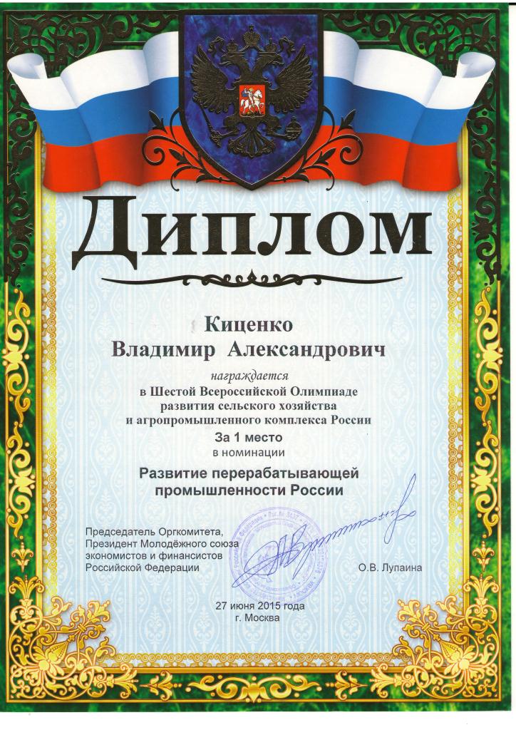 Киценко Владимир Александрович, студент 4 курса экономического факультета, специальность экономика и управление на предприятиях АПК Диплом Шестой Всероссийской Олимпиады развития сельского хозяйства и агропромышленного комплекса России за 1 место в номинации Развитие перерабатывающей промышленности России ![]() |