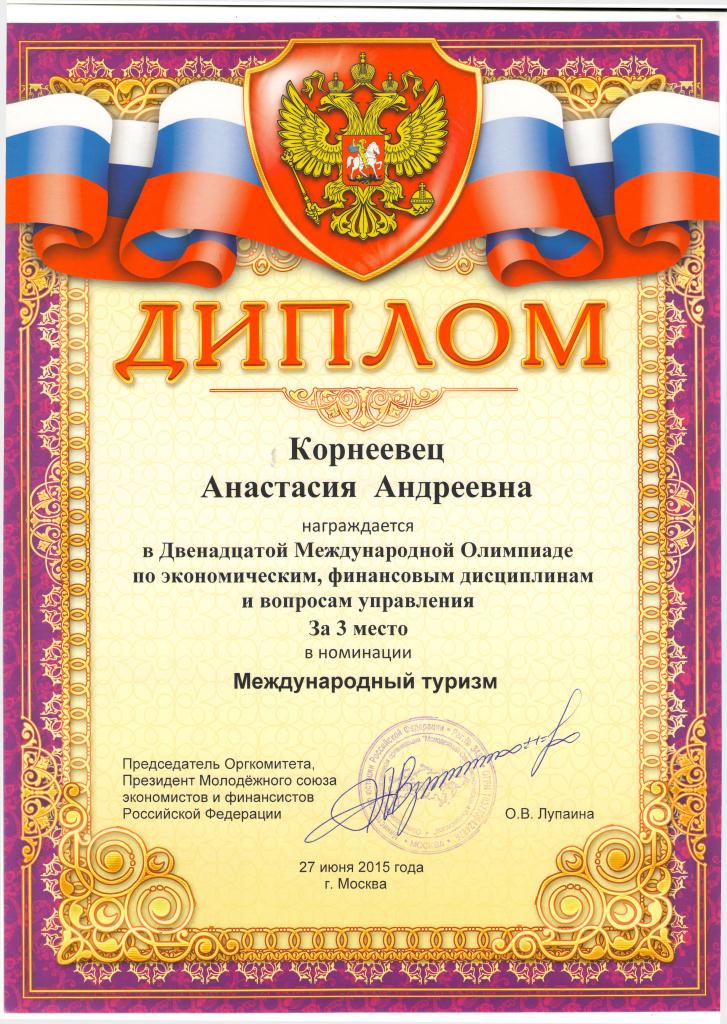 Корнеевец Анастасия Андреевна, студентка 4 курса факультета банковского дела, специальность финансы и кредит Диплом Двенадцатой Международной Олимпиады по экономическим, финансовым дисциплинам и вопросам управления за 3 место в номинации Международный туризм ![]() |