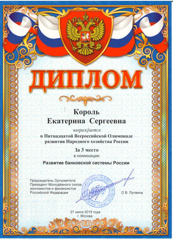 Король Екатерина Сергеевна, студентка 4 курса факультета банковского дела, специальность финансы и кредит Диплом Пятнадцатой Всероссийской Олимпиады развития Народного хозяйства России за 3 место в номинации Развитие банковской системы России ![]() |
