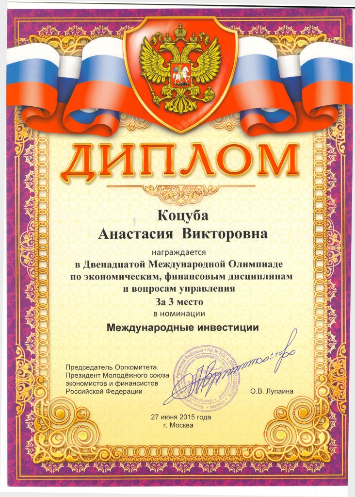 Коцуба Анастасия Викторовна, студентка 4 курса факультета банковского дела, специальность финансы и кредит Диплом Двенадцатой Международной Олимпиады по экономическим, финансовым дисциплинам и вопросам управления за 3 место в номинации Международные инвестиции ![]() |