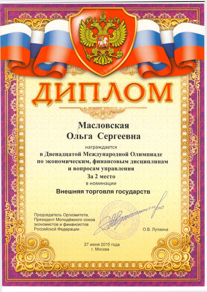Масловская Ольга Сергеевна, студентка 4 курса факультета банковского дела, специальность финансы и кредит Диплом Двенадцатой Международной Олимпиады по экономическим, финансовым дисциплинам и вопросам управления за 2 место в номинации Внешняя торговля государств ![]() |