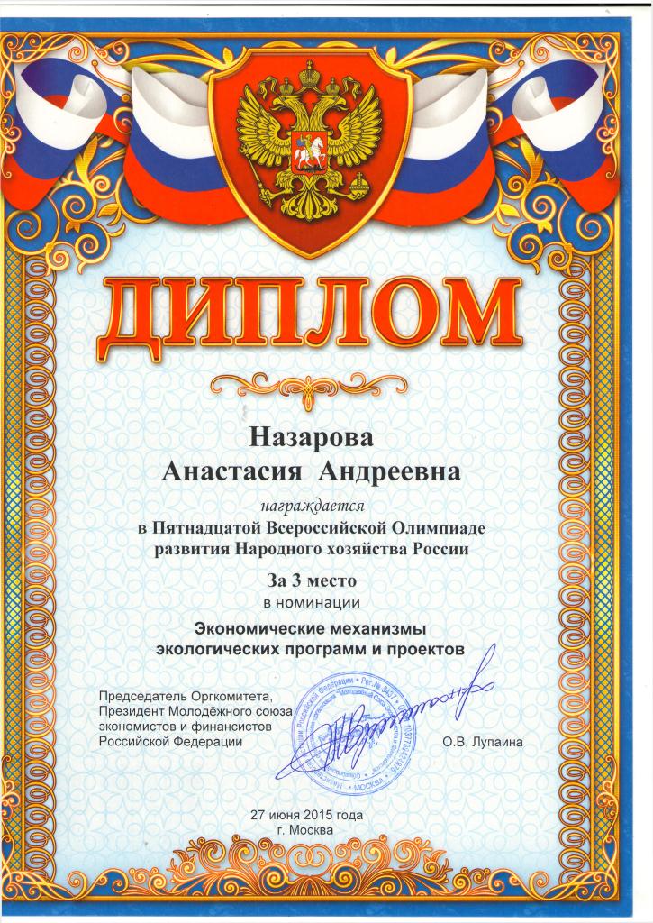Назарова Анастасия Андреевна, выпускница 2015 года экономического факультета, специальность экономика и управление на предприятии Диплом Пятнадцатой Всероссийской Олимпиады развития Народного хозяйства России 3 место в номинации Экономические механизмы экологических программ и проектов ![]() |