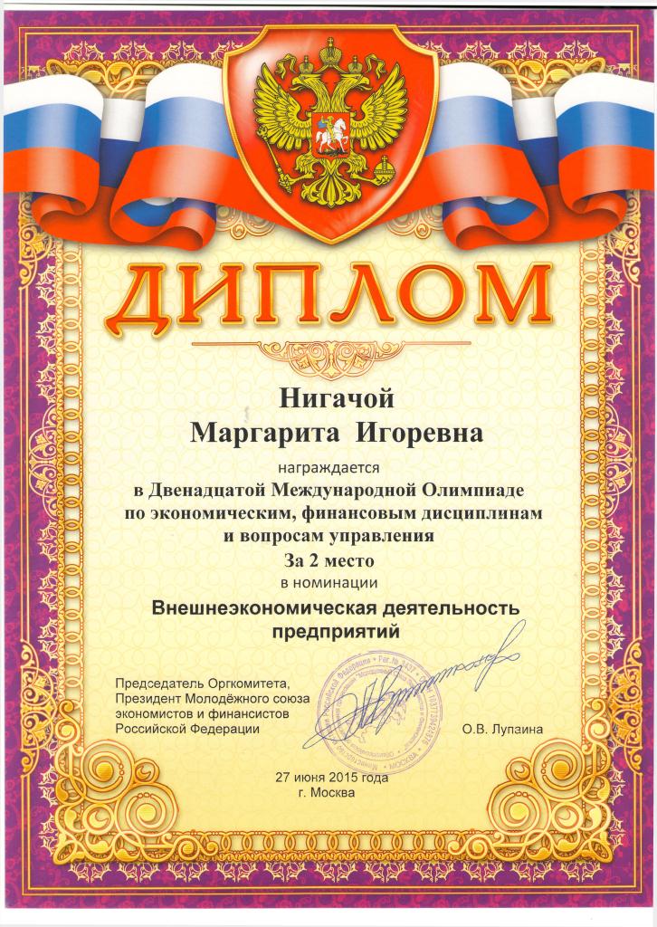 Нигачой Маргарита Игоревна, выпускница 2015 года экономического факультета, специальность экономика и управление на предприятии Диплом Двенадцатой Международной Олимпиады по экономическим, финансовым дисциплинам и вопросам управления за 2 место в номинации Внешнеэкономическая деятельность предприятий ![]() |