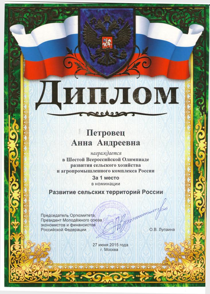 Петровец Анна Андреевна, студентка 3 курса факультета банковского дела, специальность финансы и кредит Диплом Шестой Всероссийской Олимпиады развития сельского хозяйства и агропромышленного комплекса России за 1 место в номинации Развитие сельских территорий России ![]() |