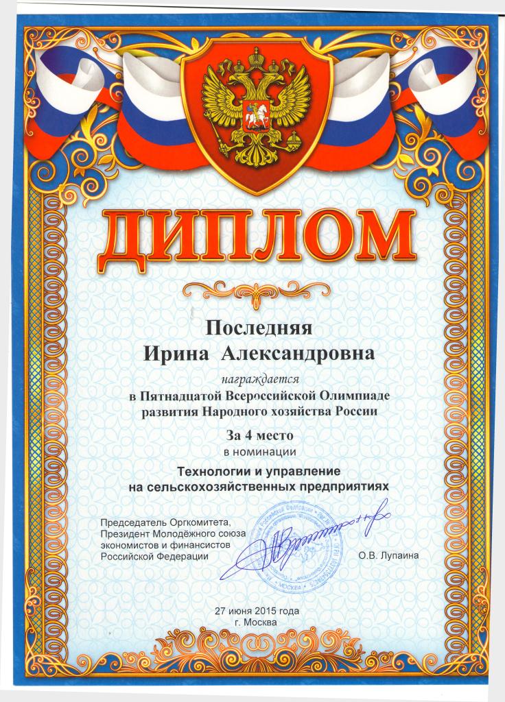 Последняя Ирина Александровна, студентка 4 курса экономического факультета, специальность экономика и управление на предприятии Диплом Пятой Всероссийской Олимпиады развития Народного хозяйства России за 4 место в номинации Технологии и управление на сельскохозяйственных предприятиях ![]() |