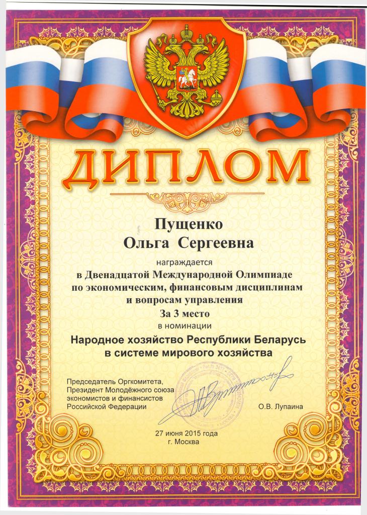Пущенко Ольга Сергеевна, студентка4 курса факультета банковского дела, специальность Финансы и кредит Диплом Двенадцатой Международной Олимпиады по экономическим, финансовым дисциплинам и вопросам управления за 3 место в номинации Народное хозяйство Республики Беларусь в системе мирового хозяйства ![]() |