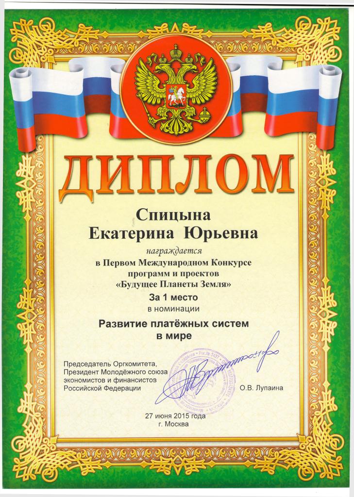 Спицына Екатерина Юрьевна, студентка 4 курса факультета банковского дела, специальность финансы и кредит Диплом Первого Международного Конкурса программ и проектов «Будущее Планеты Земля» за 1 место в номинации Развитие платежных систем ![]() |