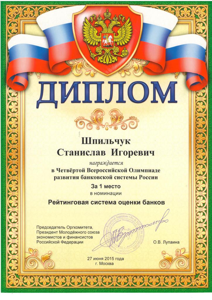 Шпильчук Станислав Игоревич, студент 4 курса факультета банковского дела, специальность финансы и кредит Диплом Четвертой Всероссийской Олимпиады развития банковской системы России за 1 место в номинации Рейтинговая система оценки банков ![]() |