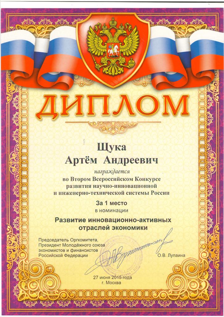 Щука Артем Андреевич, студент 4 курса факультета банковского дела, специальность финансы и кредит Диплом Второго Всероссийского Конкурса развития научно-инновационной и инженерно- технической системы России за 1 место в номинации Развитие инновационно-активных отраслей экономики ![]() |