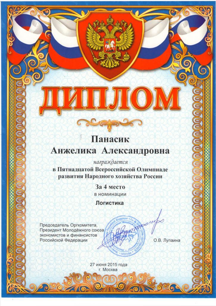 Панасик Анжелика Александровна, выпускница 2015 экономического факультета специальность экономика и управление на предприятии Диплом Пятнадцатой Всероссийской Олимпиады развития Народного хозяйства России за 4 место в номинации Логистика ![]() |