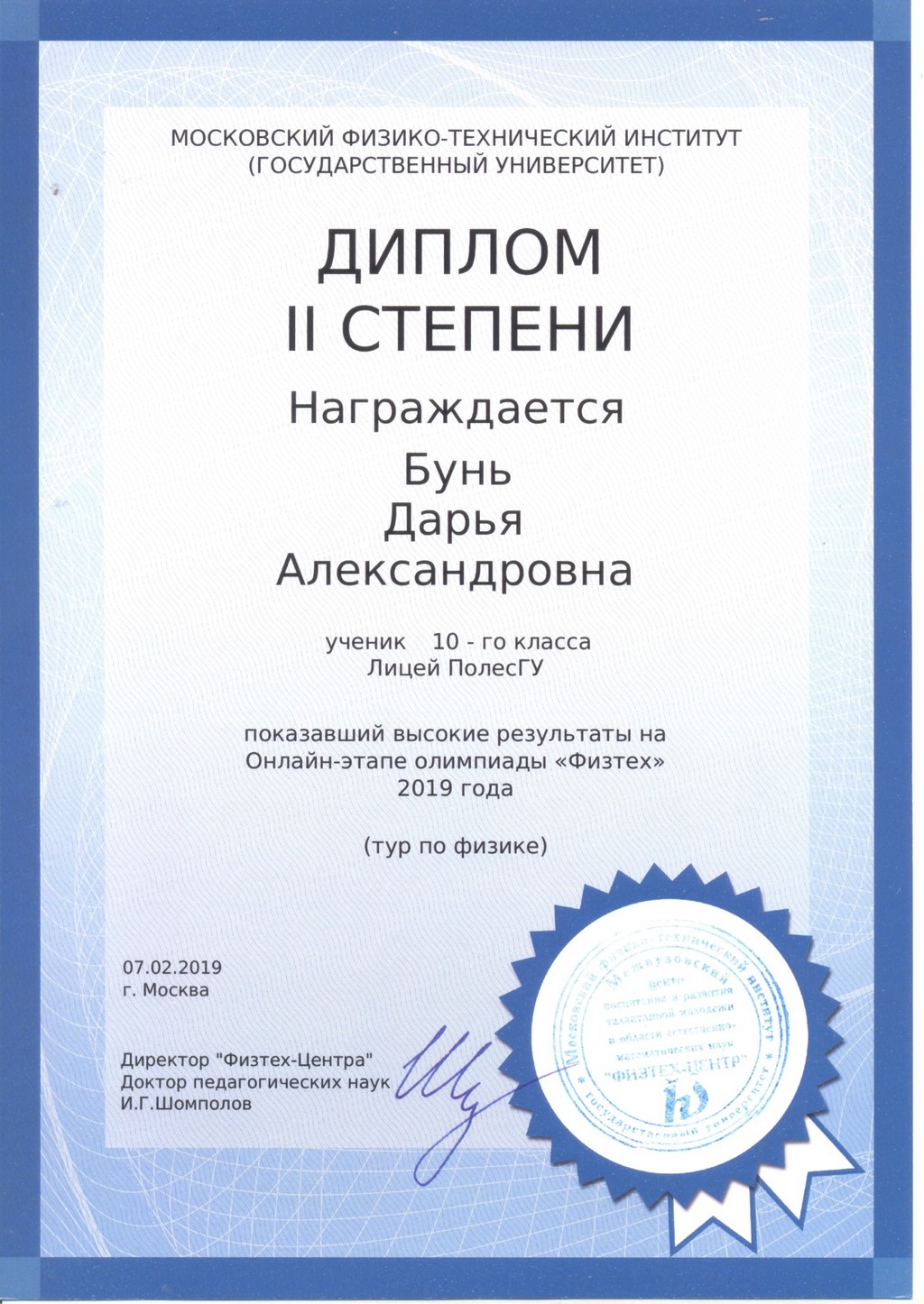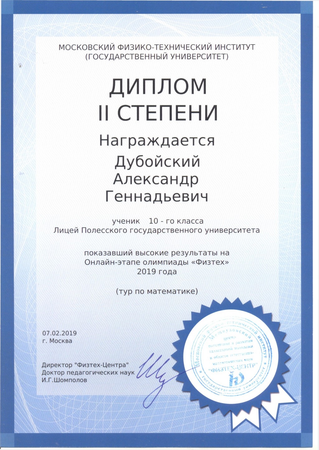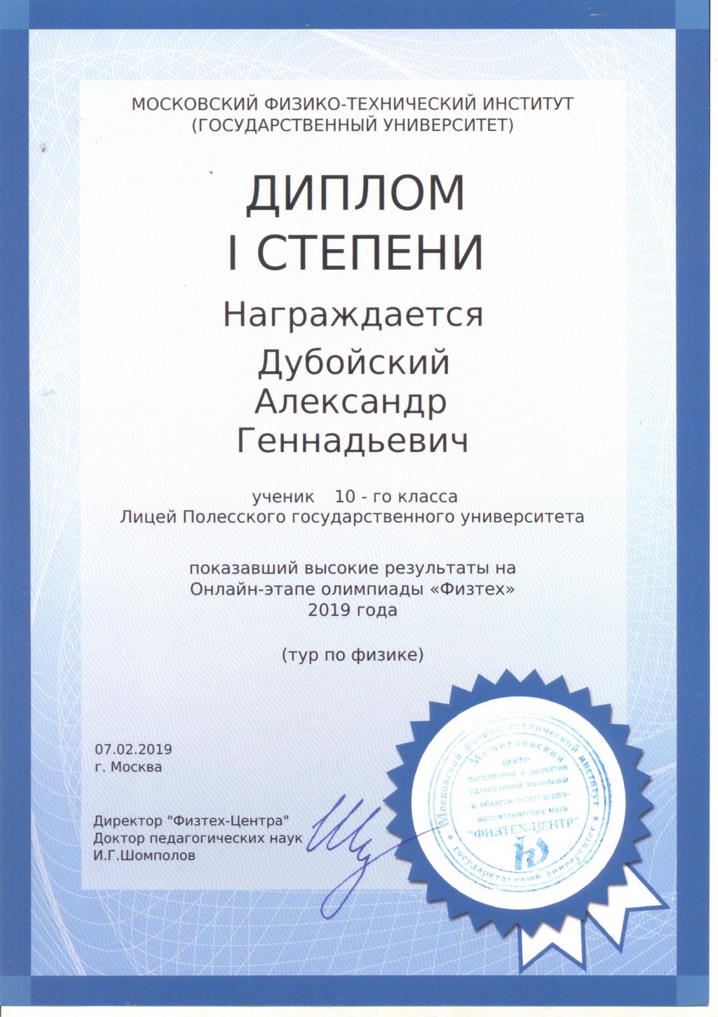 | Дубойский Александр | Диплом I – тур по физике |