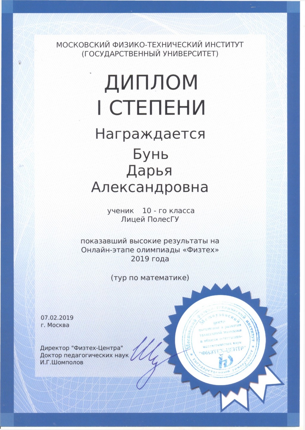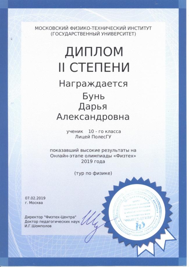 Дубойский Александр и Бунь Дарья, учащиеся 10 «А» класса лицея, показали высокие результаты на онлайн-олимпиаде «Физтех» Московского физико-технического института.