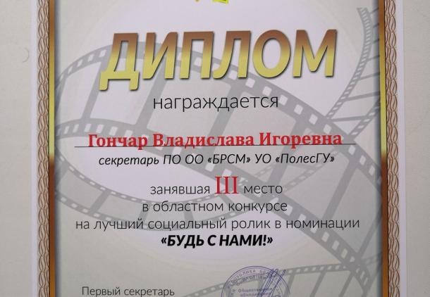 Поздравляем первичную организацию общественного объединения «БЕЛОРУССКИЙ РЕСПУБЛИКАНСКИЙ СОЮЗ МОЛОДЕЖИ» ПолесГУ занявшую 3 место в областном конкурсе на лучший социальный ролик "БУДЬ С НАМИ!".