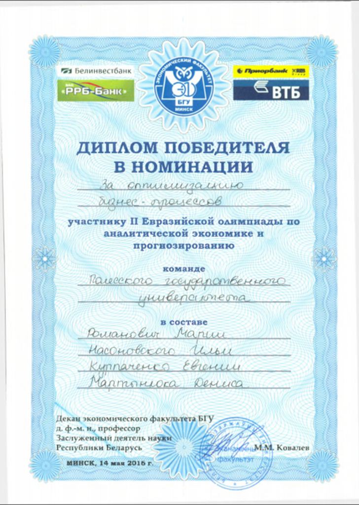 14 мая на базе экономического факультета Белорусского государственного университета прошла II Евразийская олимпиада по аналитической экономике и прогнозированию, в которой приняли участие 22 команды из 18 университетов стран ЕАЭС. По результатам заочного тура команда Полесского государственного университета вошла в число 8 лучших команд, наряду с командами таких университетов, как: Белорусский государственного университет, Московский государственный университет им. М.В. Ломоносова, Санкт-Петербургский государственный экономический университет, Белорусский государственный экономический университет, Национальный исследовательский Нижегородский государственный университет им. Н.И. Лобачевского, Гродненский государственный университет им. Я. Купалы и Белорусский национальный технический университет, и была приглашена на очный тур в Минск.