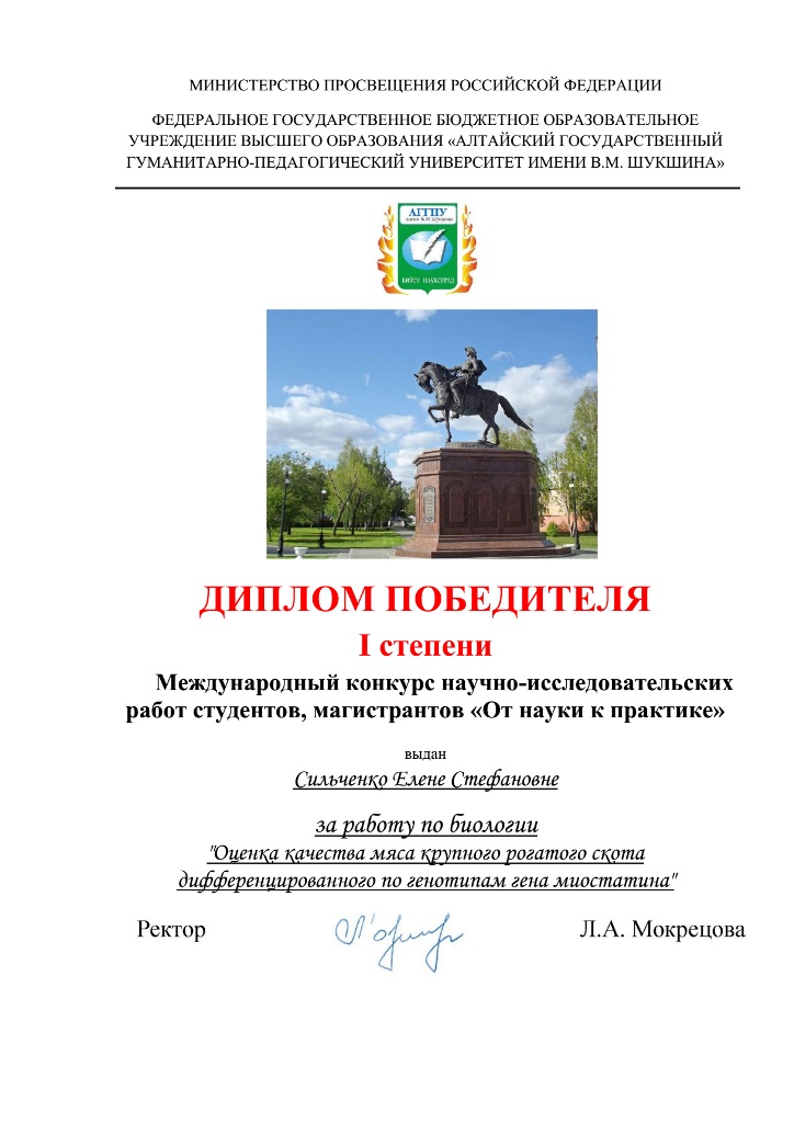 Сотрудники кафедры биохимии и биоинформатики поздравляют Сильченко Елену Стефановну с победой в международном конкурсе научно-исследовательских работ «От науки к практике» под руководством Глинской Натальи Анатольевны, кандидата с.-х. наук, доцента с работой по теме исследований «Оценка качества мяса крупного рогатого скота дифференцированного по генам миостатина».