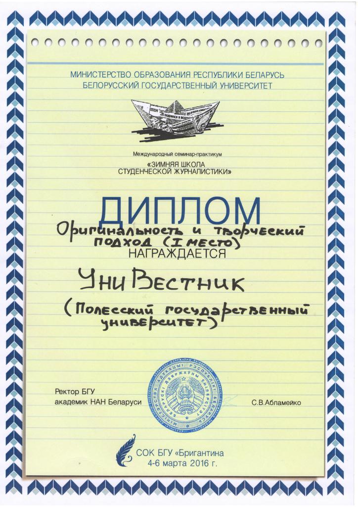 По итогам семинара-практикума газета «УниВестник» награждена дипломом за I место в номинации «Оригинальность и творческий подход». Полесский государственный университет награжден дипломом за участие в международном семинаре-практикуме «Зимняя школа студенческой журналистики».