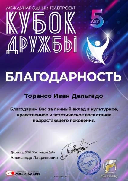 Поздравляем народный клуб любителей латиноамериканской культуры «Solymar» (руководитель Дельгадо Иван Торансо) с победой в V Международном телевизионном проекте «Кубок дружбы», проходившем 30 января 2022 года в городе Минске.