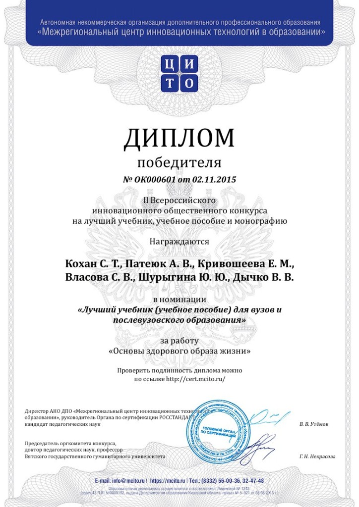 В октябре проходил II Всероссийский инновационный общественный конкурс на лучший учебник, учебное пособие, монографию, в котором в номинации "Лучший учебник (учебное пособие) для вузов и послевузовского образования" победу одержала работа "Основы здорового образа жизни" среди авторов которого доцент кафедры общей и клинической медицины кандидат медицинских наук, доцент Власова Светлана Викторовна.