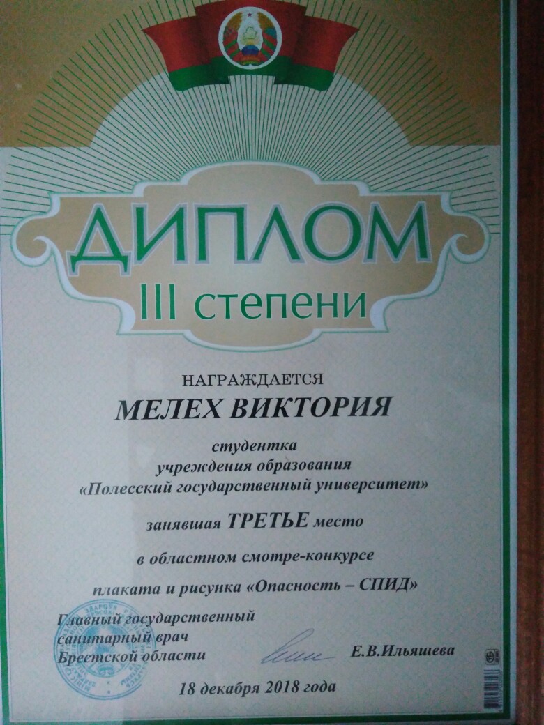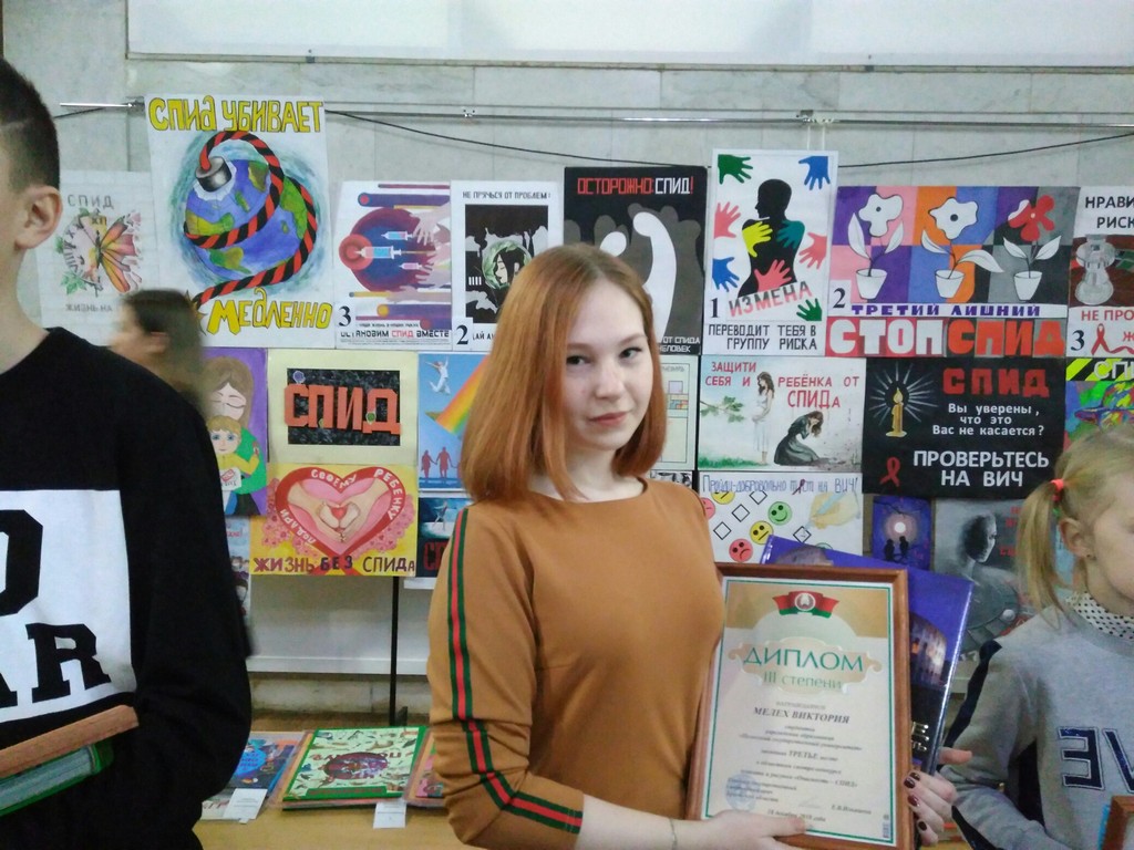 Студентка экономического факультета Мелех Виктория заняла ІІІ место в областном смотре-конкурсе плаката и рисунка "Опасность СПИД". Поздравляем Викторию и желаем ей дальнейших побед!!!