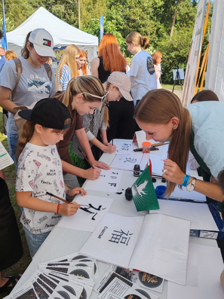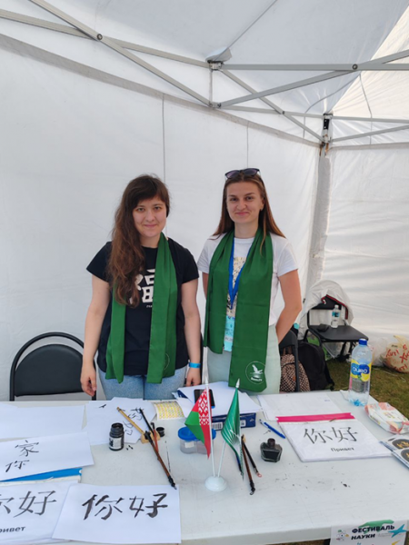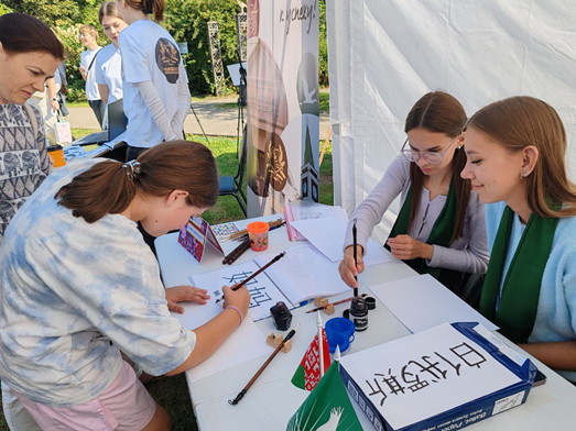 Мастер-класс по китайской каллиграфии провели преподаватель кафедры лингвистики и профессиональной коммуникации Манкевич Анна Андреевна и студентки 4 курса: Симирская Анастасия и Полешко Анна. Попробовать себя в каллиграфии изъявляли желание все участники фестиваля и представители нашего университета с радостью помогали им в этом, не только подсказывая как правильно изобразить иероглиф, но и поясняя что он означает и как произносится.
