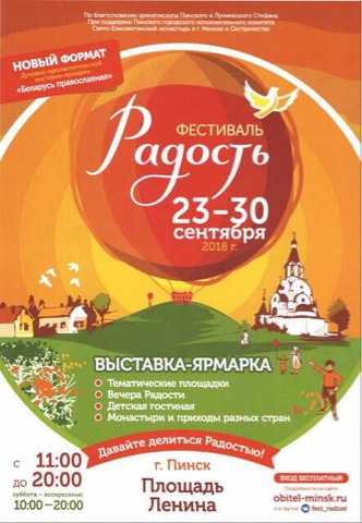 Члены СНИЛ по туризму и экскурсоведению ( руководитель ст. преподаватель Пашковец А.Н) в рамках дисциплины «Экскурсоведение» посетили международный православный фестиваль «Радость», который проходил с 23 по 30 сентября в г. Пинске. Главная цель масштабного мероприятия –  сохранение нашего исторического  и культурного наследия. Для гостей фестиваля, который проходил под девизом «Давайте дарить радость», были подготовлены различные тематические площадки, мастер-классы, лекции, встречи, музыкальные мероприятия. Белорусские и российские издательства представили широкий ассортимент духовной литературы. Народные мастера представили изделия из керамики, козьего пуха, платки, палантины  и многое другое. Также на  выставке можно будет приобрести масла, травы, мед и др. Выставка собрала участников из Белоруссии, России, Украины, Молдовы, Сербии, Греции. Выставку сопровождала широкая духовно-просветительская программа, в рамках которой прошли круглые столы, презентации, семинары, лекции, творческие встречи, кинолектории. Данная выставка призвана способствовать возрождению православной культуры в Беларуси, духовно-нравственному просвещению и воспитанию населения.  Фестиваль «Радость»- это захватывающий  и увлекательный праздник!