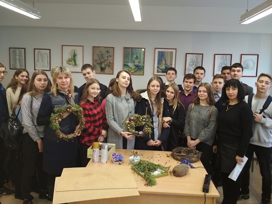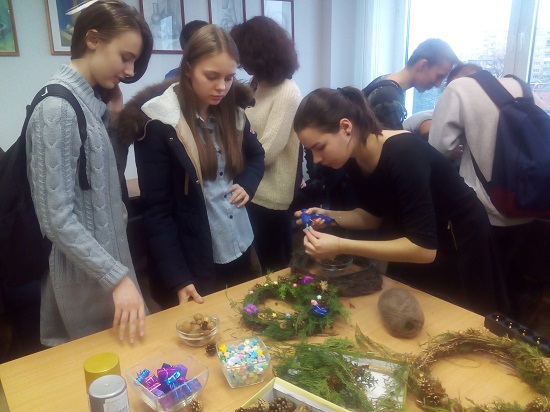 Финальная часть экскурсии была посвящена мастер-классу по фитокомпозиции, приуроченному наступающим новогодним праздникам. Студенты группы 15СПС-1 показали школьникам как изготовить рождественский венок из фитоматериалов.