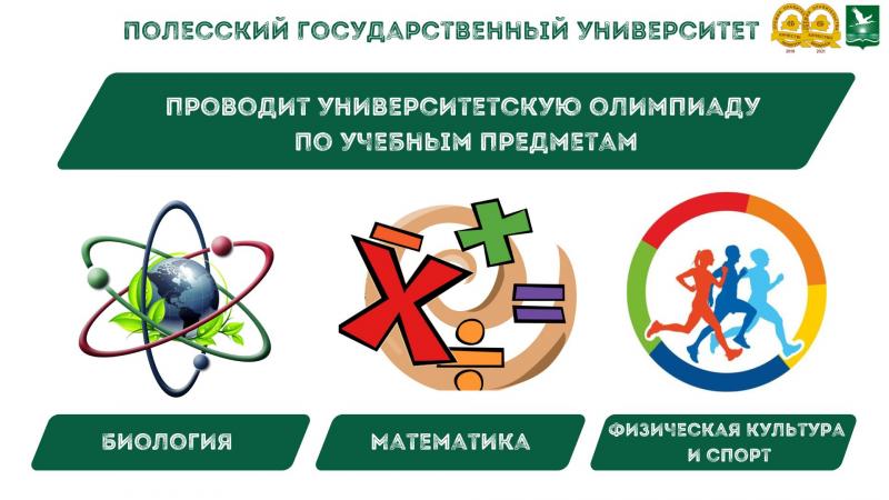 Предлагаем Вам принять участие в Университетской олимпиаде по учебным предметам: «Биология», «Математика», «Физическая культура и спорт», победители которой (дипломы I, II, III степени заключительного этапа) имеют право на зачисление в учреждение высшего образования «Полесский государственный университет».