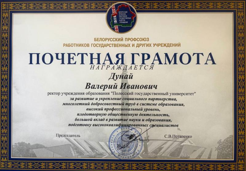 4 августа 2025 года ректору Полесского государственного университета Дунаю Валерию Ивановичу Белорусский профсоюз работников государственных и других учреждений вручил Почетную Грамоту за развитие и укрепление социального партнерства, многолетний добросовестный труд в системе образования, высокий профессиональный уровень, плодотворную общественную деятельность, большой вклад в развитие науки и образования, подготовку высококвалифицированных специалистов.