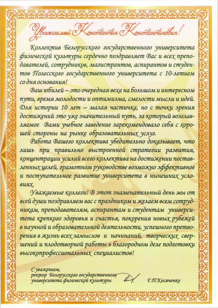 Ректор учреждения образования «Белорусский государственный университет физической культуры» Косяченко Г.П.