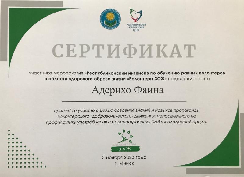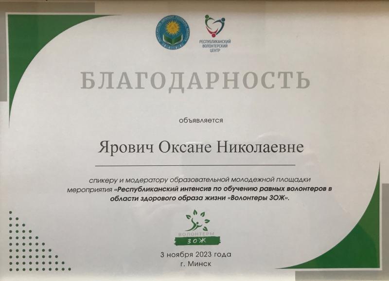 Руководитель волонтёрского центра Полесского государственного университета Ярович Оксана Николаевна, а также волонтёр равного обучения команды «Территория НЕзависимости» Адерихо Фаина, приняли участие в Республиканском интенсиве по обучению равных волонтеров в области здорового образа жизни «Волонтеры ЗОЖ».