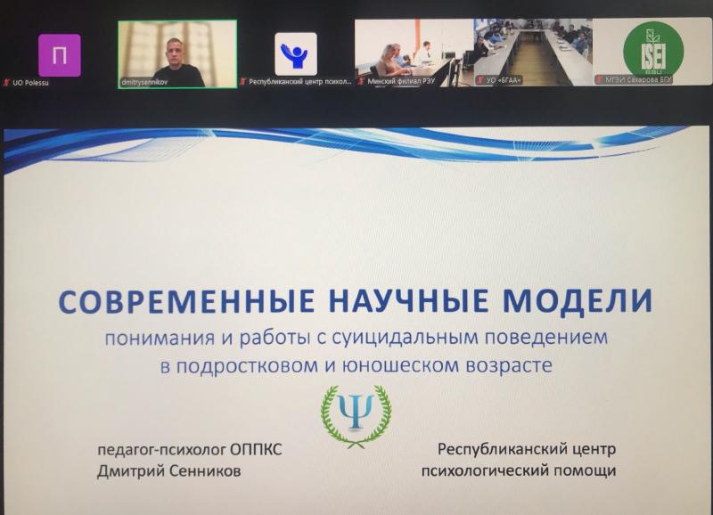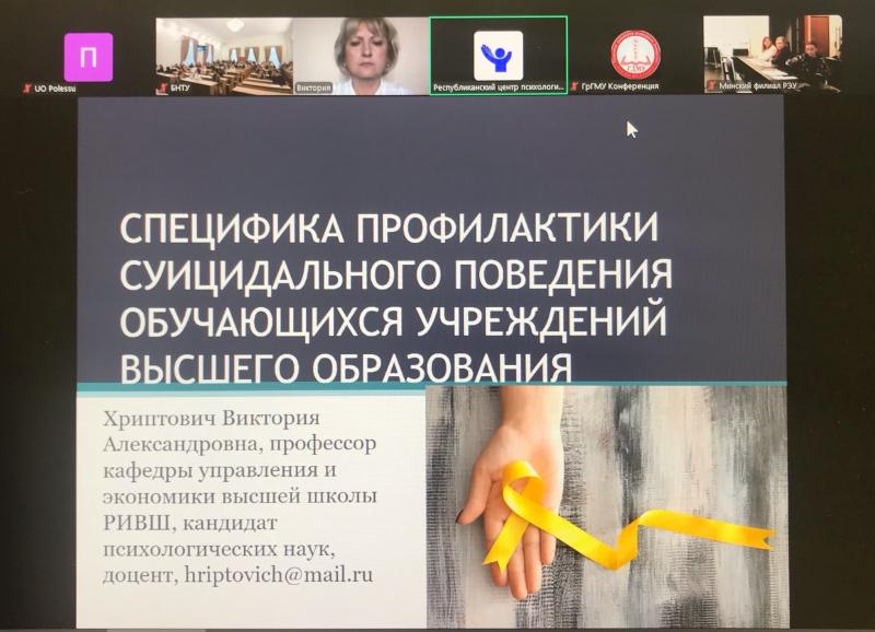 13 ноября в онлайн-формате состоялся республиканский семинар «Профилактика суицидального поведения обучающихся», в котором приняли участие начальник отдела по идеологической и воспитательной работе Ярович Оксана Николаевна, сотрудники отдела по идеологической и воспитательной работе, заместители деканов по идеологической и воспитательной работе, кураторы учебных групп, воспитатели общежитий.