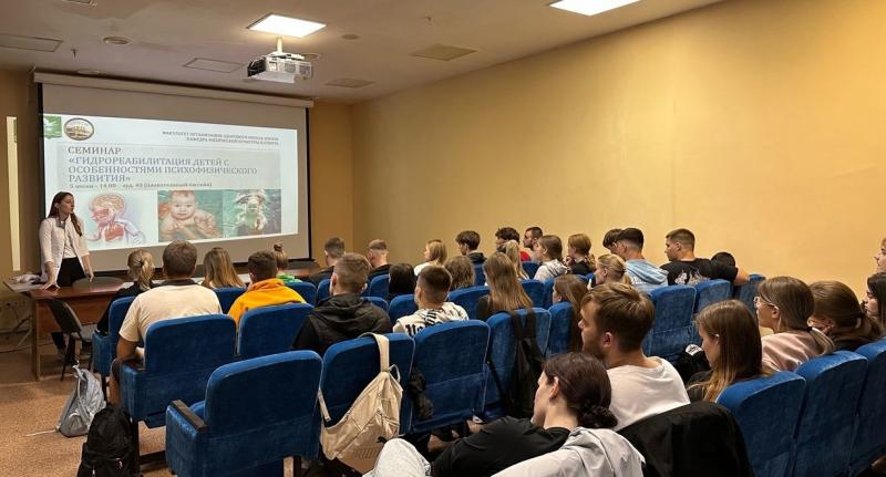 Для студентов факультета, обучающихся по специальностям: «Физическая реабилитация и эрготерапия (по направлениям)», «Оздоровительная и адаптивная физическая культура (по направлениям)» были представлены основные направления и особенности работы в воде с детьми грудничкового и раннего возраста. Подробно разобраны часто встречающиеся ошибки при выполнении поддержек, проводок и приемов ныряния. Студенты ознакомились с направлениями коррекционной работы в воде и получили необходимые теоретические основы гидрореабилитации.