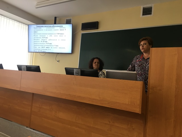 Спикерами на нашей встрече выступили: Жоголь Татьяна Викторовна - старший преподаватель кафедры менеджмента и маркетинга, рассказавшая о правилах составления резюме и Шульга Марина Леонидовна - старший преподаватель кафедры историко-культурного наследия, рассказавшая о правилах поведения при прохождении собеседования.