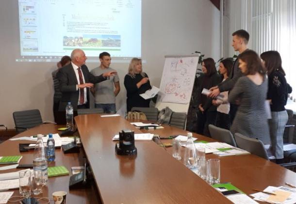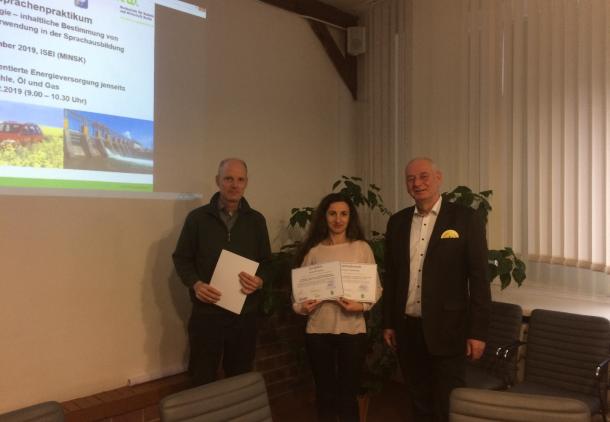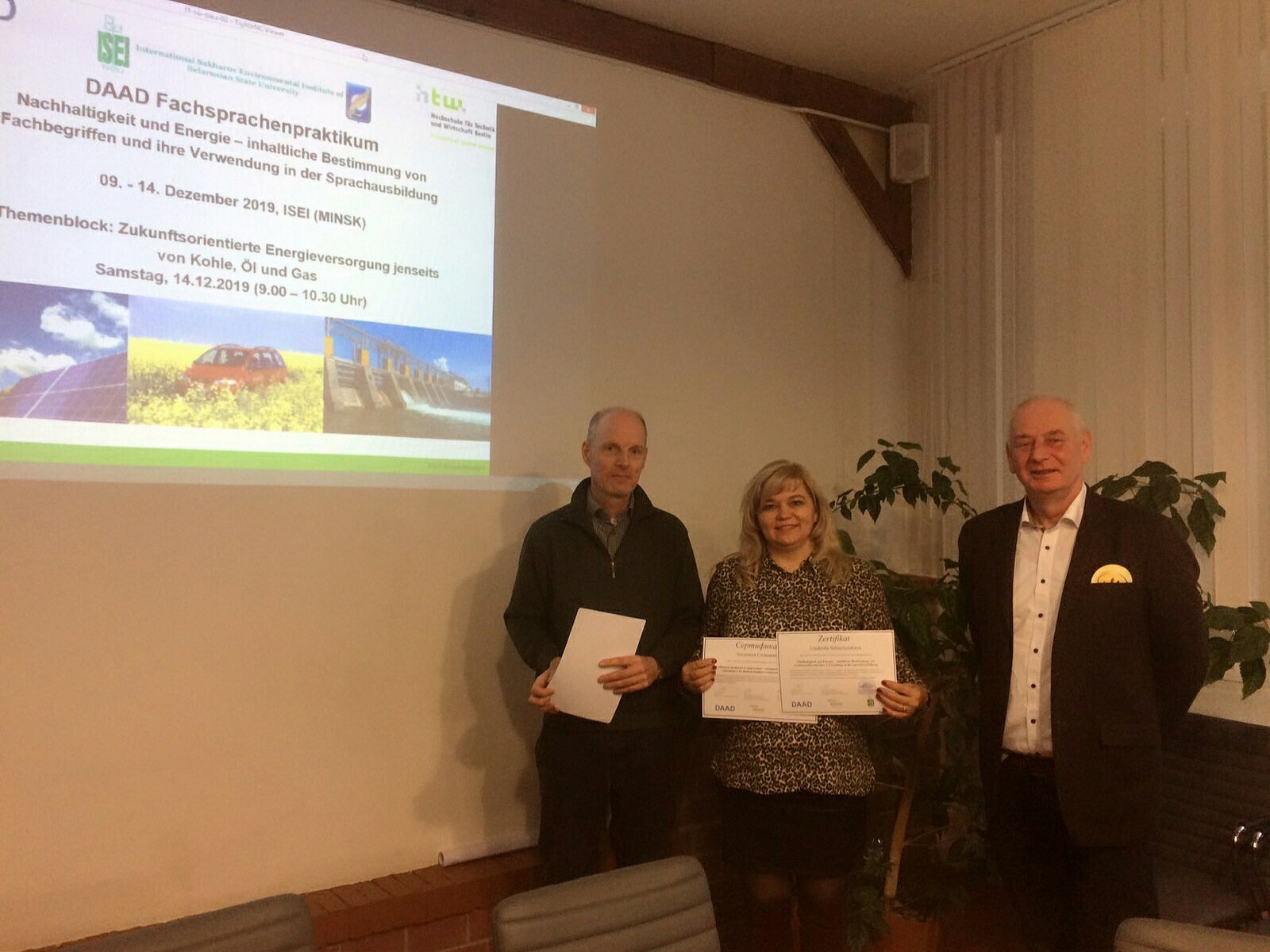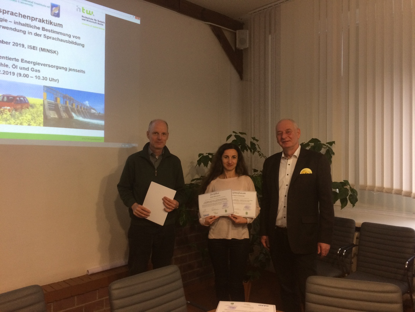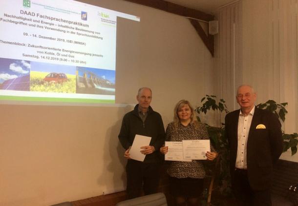 Преподаватели кафедры лингвистики и бизнес-коммуникаций Селиванова Е.А. и Селюжицкая Л.Н. успешно приняли участие в семинаре DAAD «Устойчивое развитие и энергетика – содержательное определение терминов и их использование в языковой подготовке» с 9.12.2019 по 14.12.2019. Семинар проводился в УО «Международный государственный экологический институт имени А.Д. Сахарова» при поддержке Германской службы академических обменов (DAAD). Программа включала в себя лекции и практические занятия в общем объёме 30 академических часов и однодневную тематическую экскурсию в экологическую деревню Дружная-Стаховичи. Лекции и практические занятия проводил доктор технических наук, профессор, профессор факультета инженерных наук берлинской высшей школы техники и экономики. По итогам семинара участники получили сертификаты.