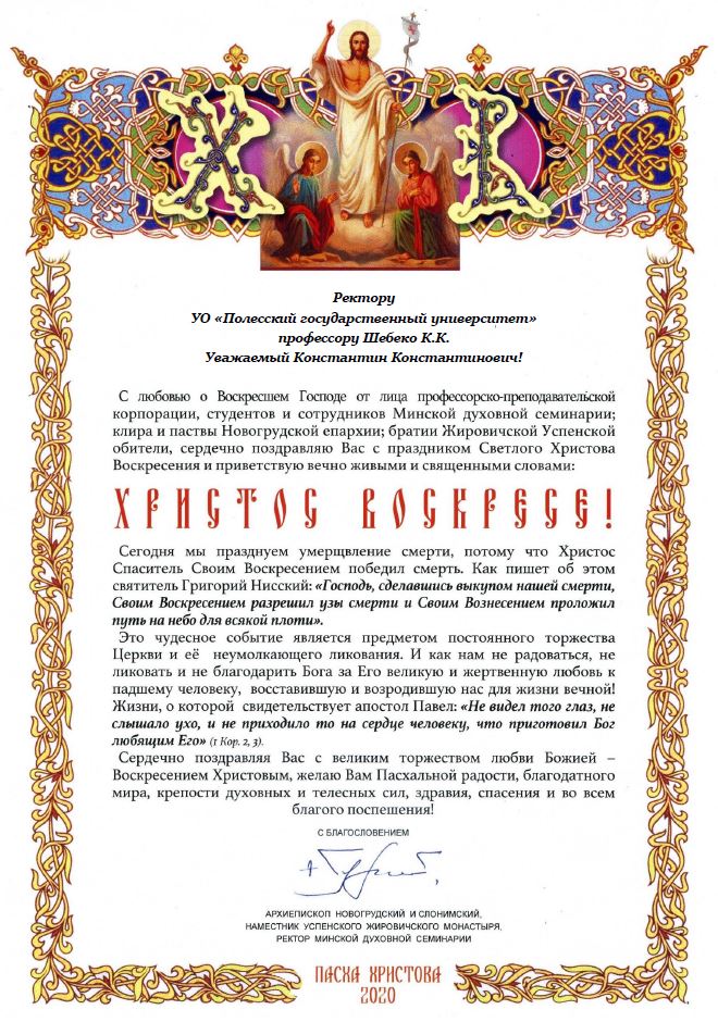 Со Светлой Пасхой университет поздравил ректор Минской духовной семинарии