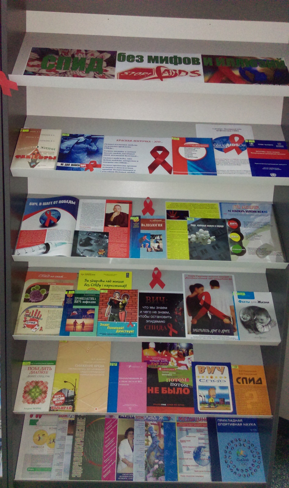 «СПИД без мифов и иллюзий» - так называется книжно-журнальная выставка, которая экспонируется на абонементе учебной литературы (учебный корпус №1). На ней представлена учебная, научная, научно-популярная литература, буклеты, брошюры. Материалы выставки излагают историю заболевания, раскрывают многогранность медицинских, психологических и социальных проблем ВИЧ/СПИДа, дают рекомендации по профилактике опасного недуга.